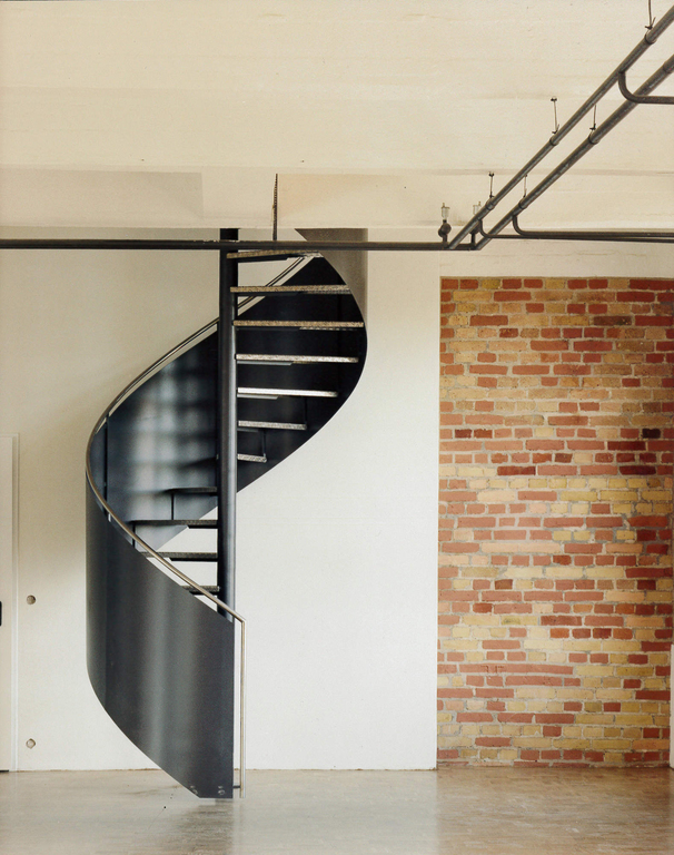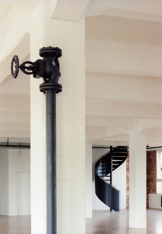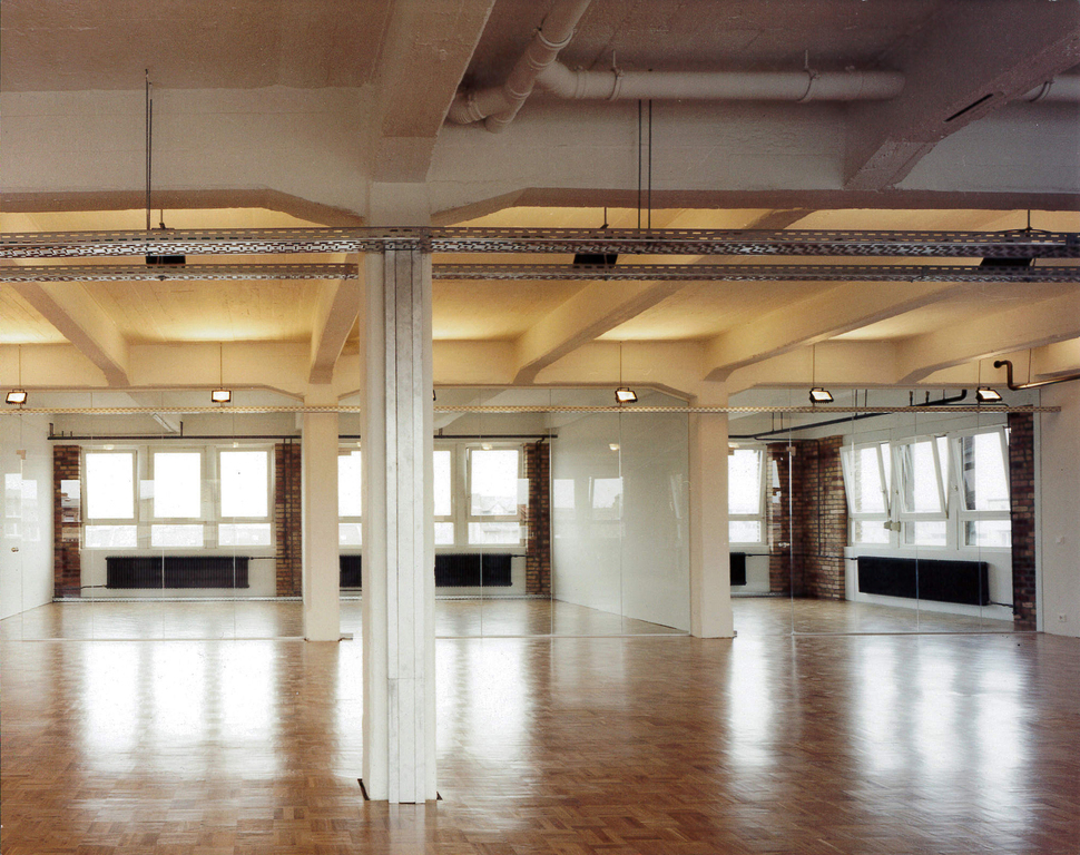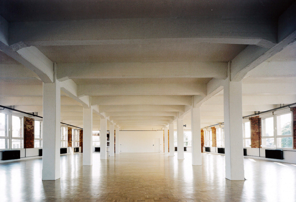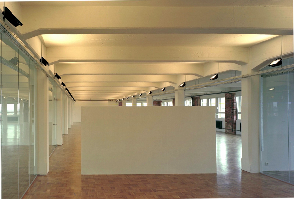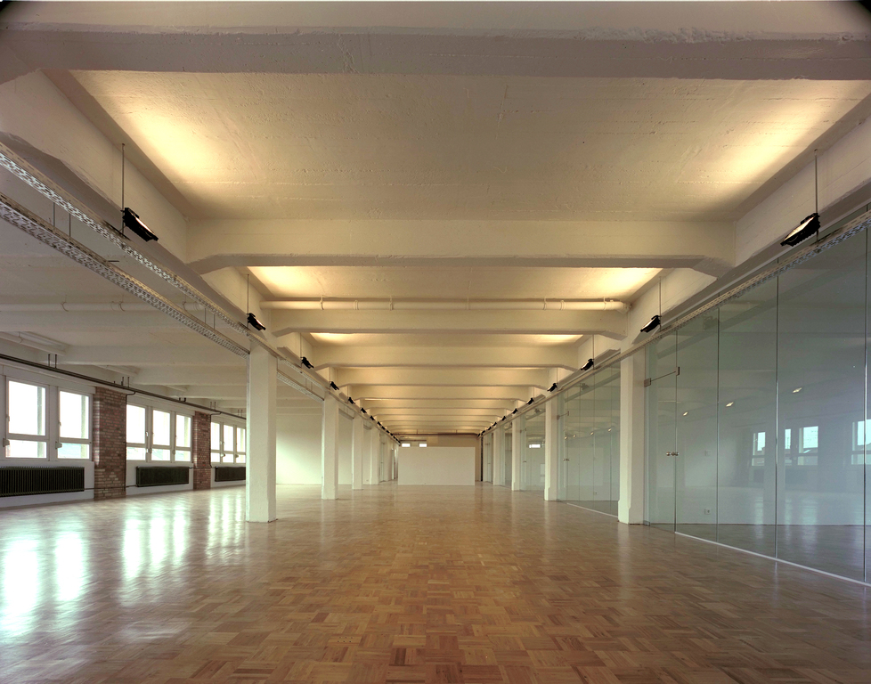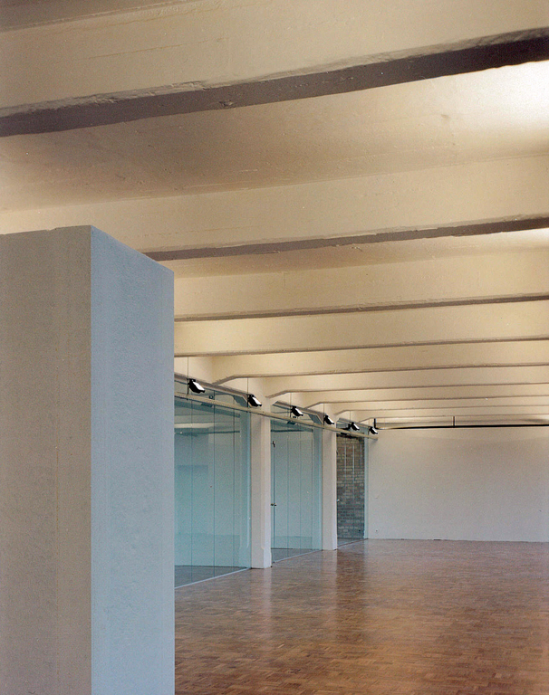 Die serielle Struktur der dreischiffigen Stahlbeton-Konstruktion stand im Mittelpunkt. Indirektes, an die Decke gerichtetes Licht wurde eingesetzt, die Ziegelwände freigelegt. Quergestellte Schotts im Seitenschiff schaffen Räume für kleine Einzelbüros. Sprossenlose, raumhohe Glasmembranen trennen diese vom Großraumbüro. Das alte Heizsystem wurde belassen und wirkt wie ein übriggelassenes Relikt aus vergangenen Zeiten.