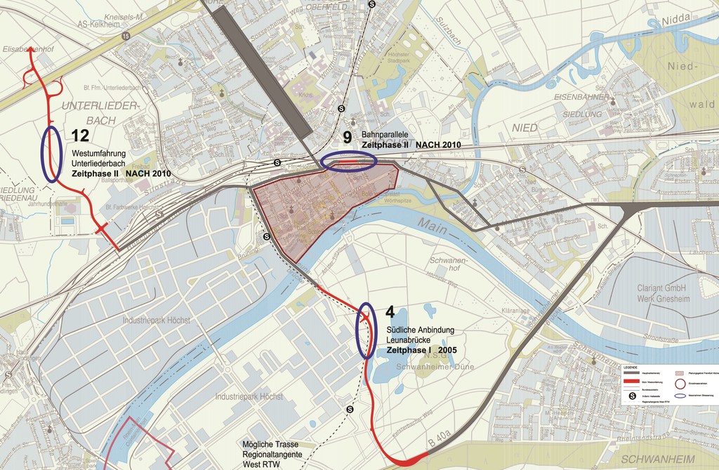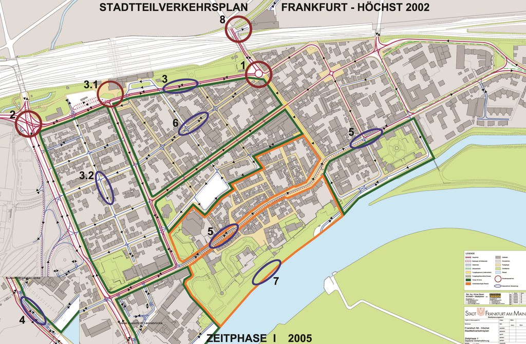 In dem Verkehrskonzept wurden neben verkehrsplanerischen Aspekten auch stadt- und landschaftsplanerische Überlegungen berücksichtigt. Eine Verkehrsberuhigung der Kernstadt erfolgte durch eine Verlagerung des Durchgangsverkehrs an die Stadtteilränder. Geringere Fahrgeschwindigkeiten bedeuten schmälere Fahrbahnen und mehr Raum für den ruhenden Verkehr, für Radfahrer und Fußgänger und somit auch Vorteile für die Anwohner und die Geschäfte. Vertiefend untersucht wurden der Dalberg- und Leunaknoten sowie die Verlegung der Straßenbahnendhaltestelle.