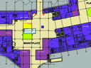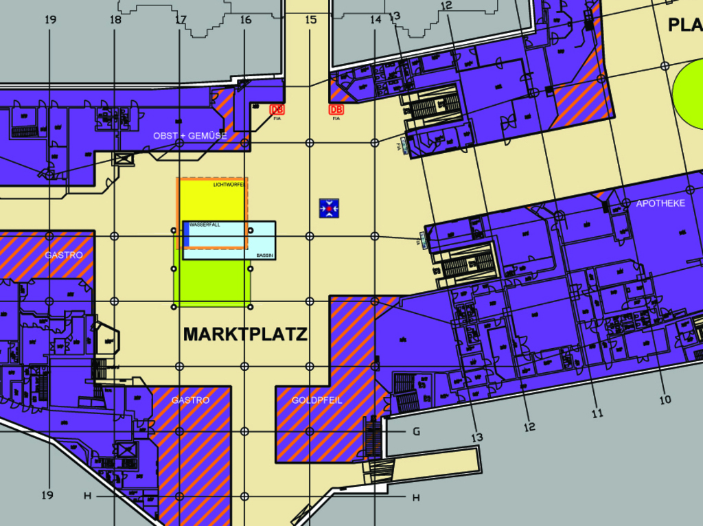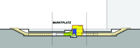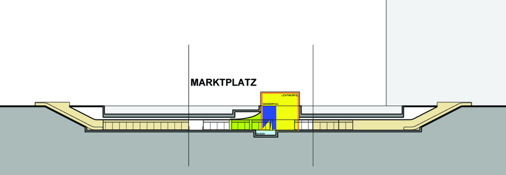 Aufgrund rückläufiger Fußgängerzahlen wird eine Treppenanlage vor der Bahnhofshalle abgebrochen. Anstelle dessen entsteht ein Platz unter dem Platz mit Tageslichteinfall über einen aufgesetzten, 10×10×4m großen Glaskubus und einem Wasserbecken. Die Verkehrsflächen um diesen zentralen Marktplatz werden in der südlich anschließenden Passage verkleinert zugunsten größerer Bereiche für die Gastronomie. Die freistehenden Säulen können somit in die neu geschaffenen Geschäfte integriert und übersichtlichere Räume geschaffen werden.