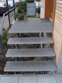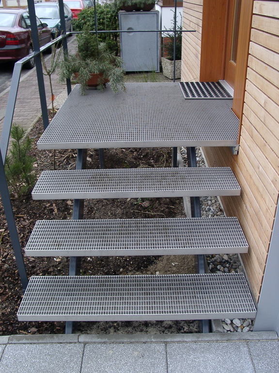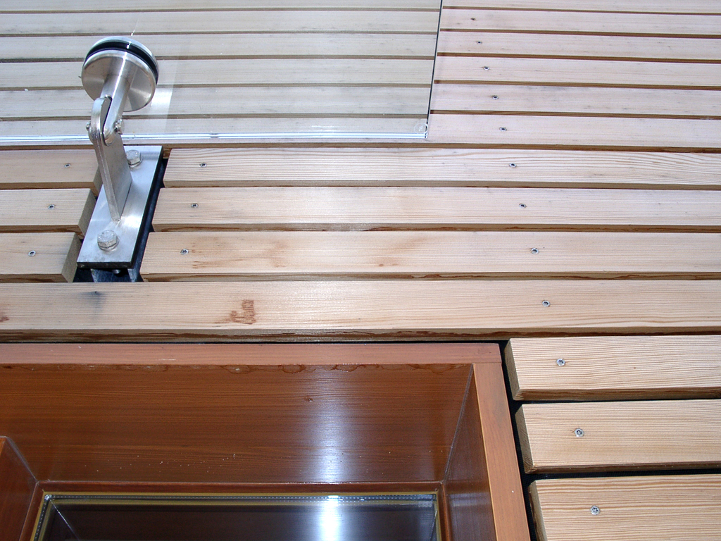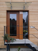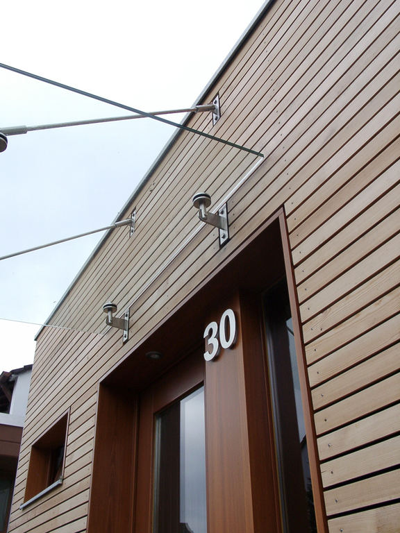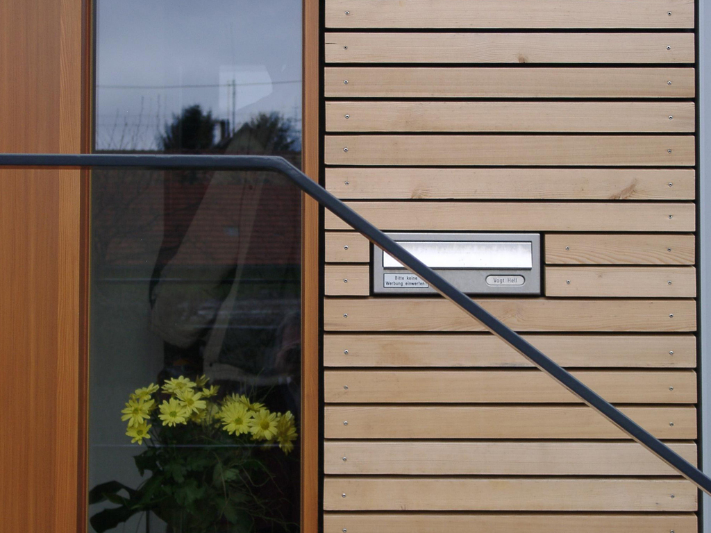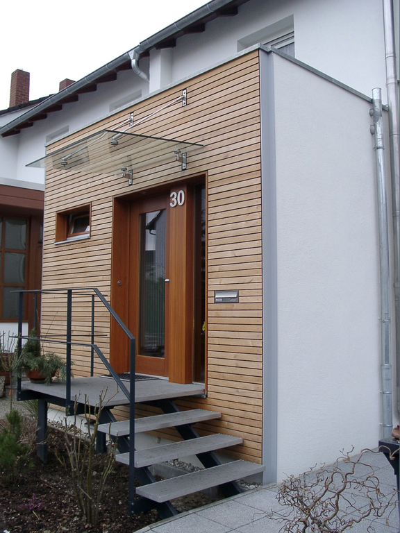 Ein Windfang von 1970 wurde so verändert, dass er den Anforderungen an Komfort und Praktikabilität entspricht. Der Zugang wurde auf die Vorderseite gedreht. Die Eingangstür klar verglast. Durchblicke entstehen. Die Materialien des kubischen Baukörpers verweisen auf die Umgebung. Die Frontseite wurde mit einer abgesetzten Scheibe aus unbehandelten Lärchenholzlamellen betont. Treppe und Vordach zurückhaltend davor gesetzt. Die Seitenwände verputzt. Sie beziehen sich auf das Haus und die Zeile.