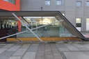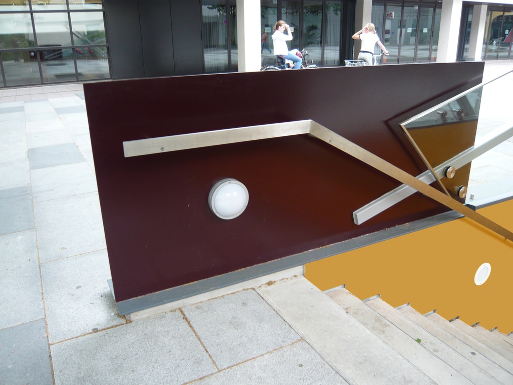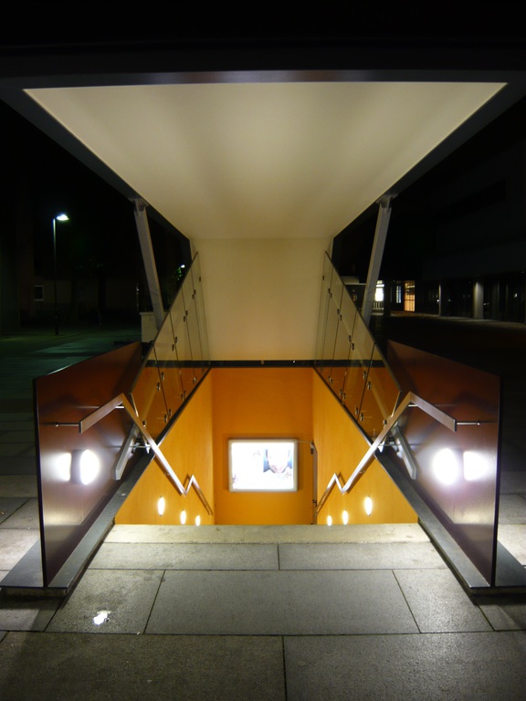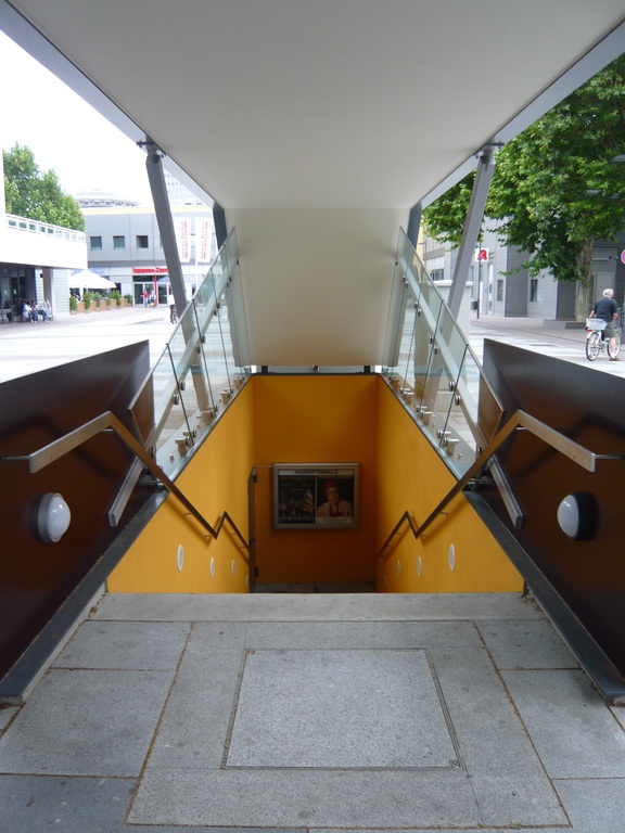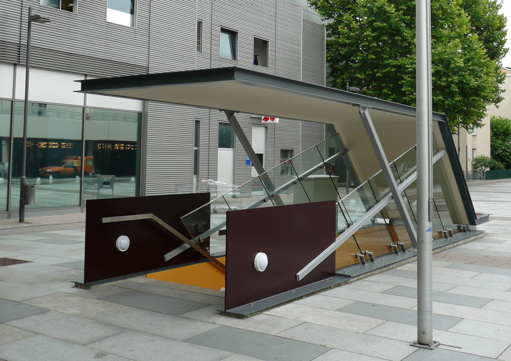 Zwei Treppenanlagen einer Tiefgarage aus den 60er Jahren auf einem neugestalteten Platz waren zu überdachen. Ein Vorentwurf der Stadt lag vor, der, grundlegend überarbeitet, bis zur Baureife entwickelt wurde.