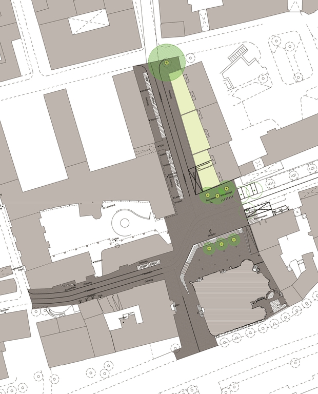 Die Buchgasse erhält breitere Gehwege. Höher gelegte Sandsteinmauern der Topografie folgend fassen die privaten Grünflächen."