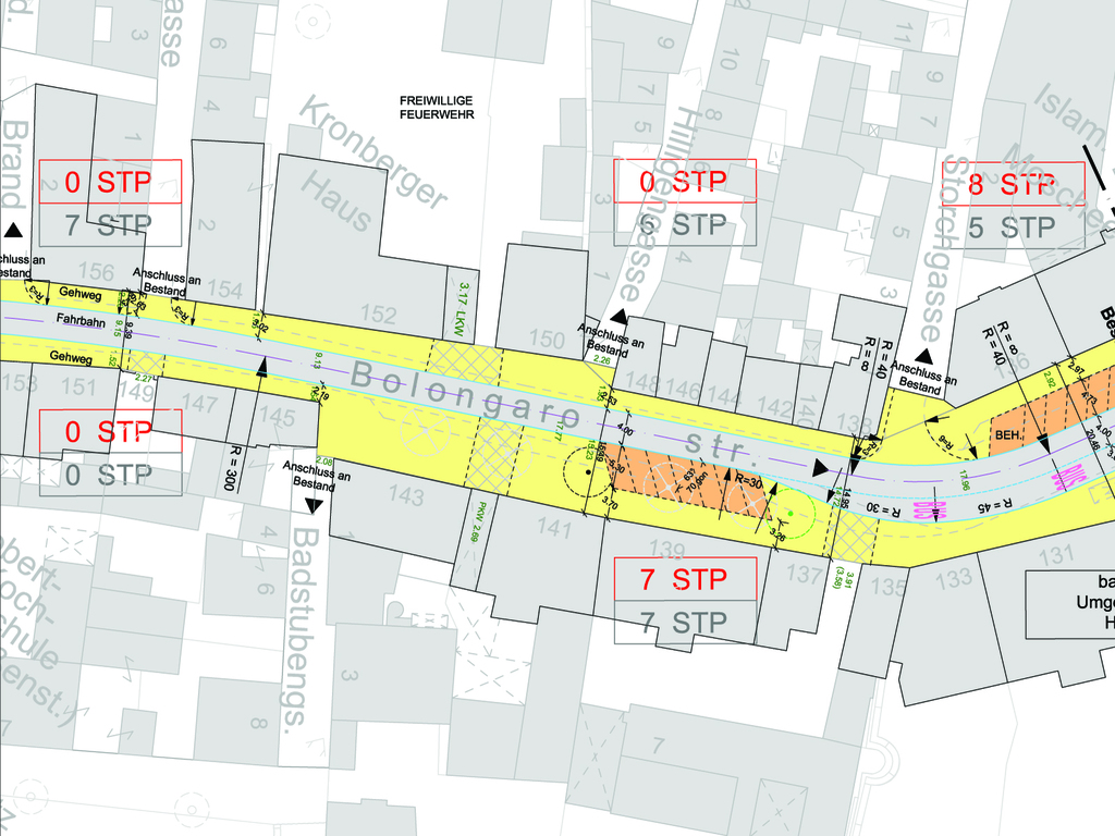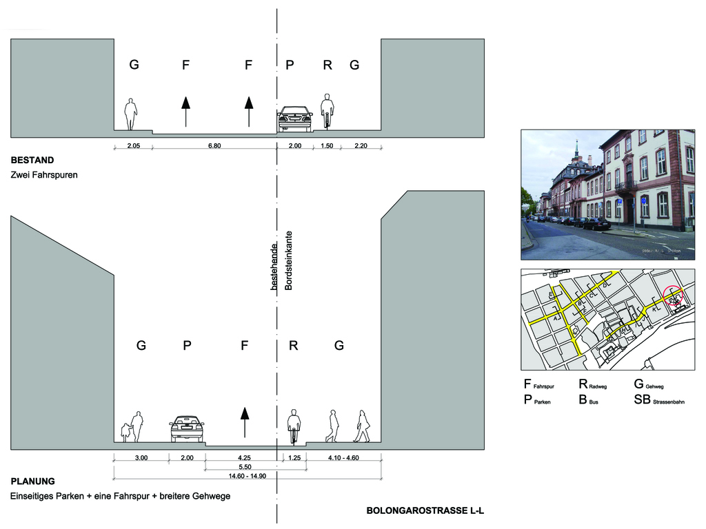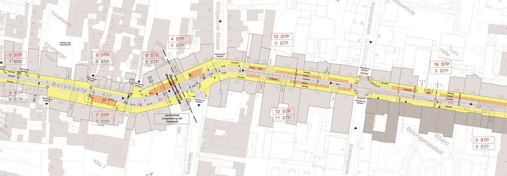 Im Zuge der weiterführenden Bearbeitung des Stadtteilverkehrsplans waren eine straßenraumgestalterische und verkehrsfunktionale Aufwertung der drei Straßen durch eine Vorplanung zu entwickeln. Die Aufenthaltsqualität für Anwohner und Besucher konnte durch ein Verbreitern der Gehwege und eine Neuordnung der Stellplätze verbessert werden. Linienbusführung, Stellplatzanzahl und Radfahren gegen die Einbahnstraße waren zu berücksichtigen. Im Bereich des ehemaligen Marktplatzes vor dem alten Antoniterkloster wird eine Platzfläche geschaffen.