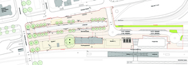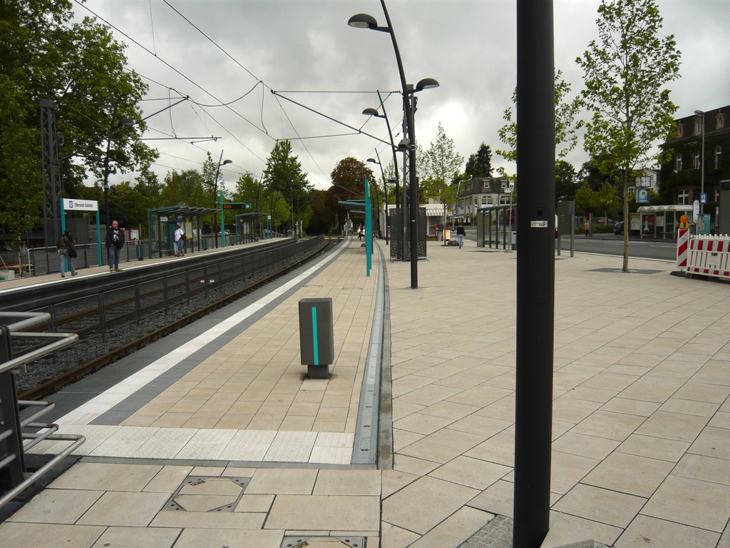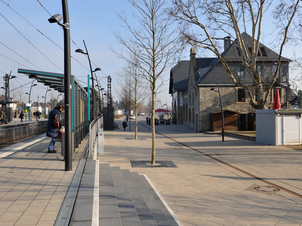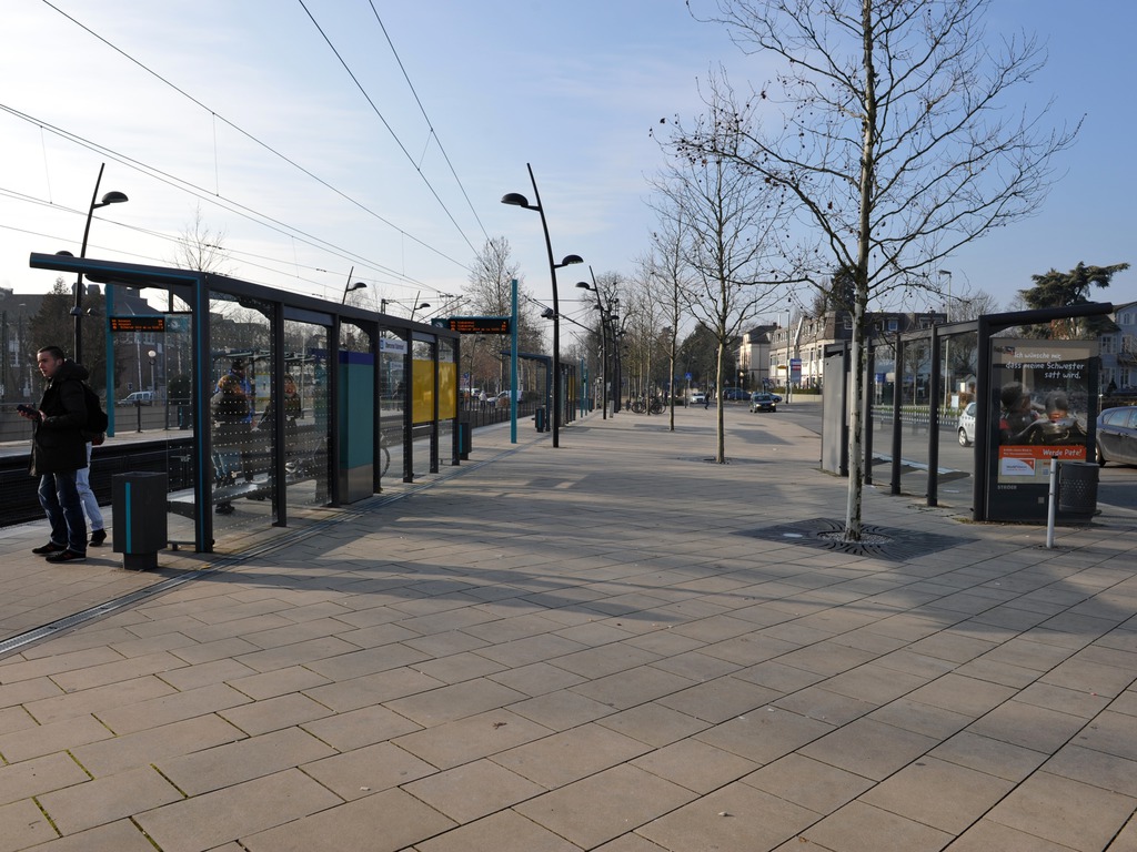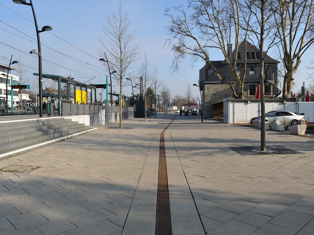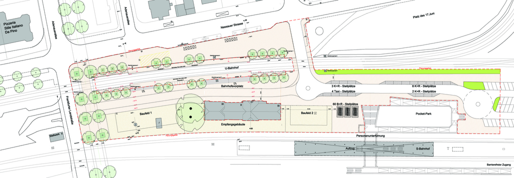 Überschaubare Platzflächen mit einem einheitlichen Oberflächenbelag aus beigefarbenen, großformatigen Betonwerksteinplatten und breite Treppenanlagen bilden einen verkehrsberuhigten, städtischen Raum. Im Mittelpunkt des Vorplatzes liegt eine U-Bahnstation. Baumreihen akzentuieren diesen Ort und führen hin auf eine in Nord-Südrichtung verlaufende ortsbildprägende, alte Kastanienallee. Der Fahrverkehr wird konsequent an die Ränder des Vorplatzes gelegt, dorthin wo die besten Verknüpfungen zu S- und U-Bahn bestehen.
