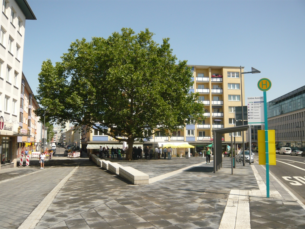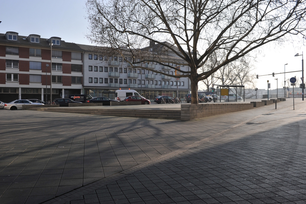 Am nördlichen Brückenkopf der Alten Brücke an der Stelle des Eingangs in die ehemalige Altstadt erhielt eine dreieckige Verkehrsrestfläche aus den 50er Jahren durch das Zurückdrängen des Fahrverkehrs erstmals einen Platzcharakter. Im Läuferverband gemauerte Sitzmauern aus großformatigen, sandgestrahlten Sichtbetonblöcken und eine breite Freitreppe zeichnen die untergegangene Bebauung nach. Im Mittelpunkt steht die großzügige Nord-Süd-Verbindung für die Fußgänger und Radfahrer in der Fahrgasse.